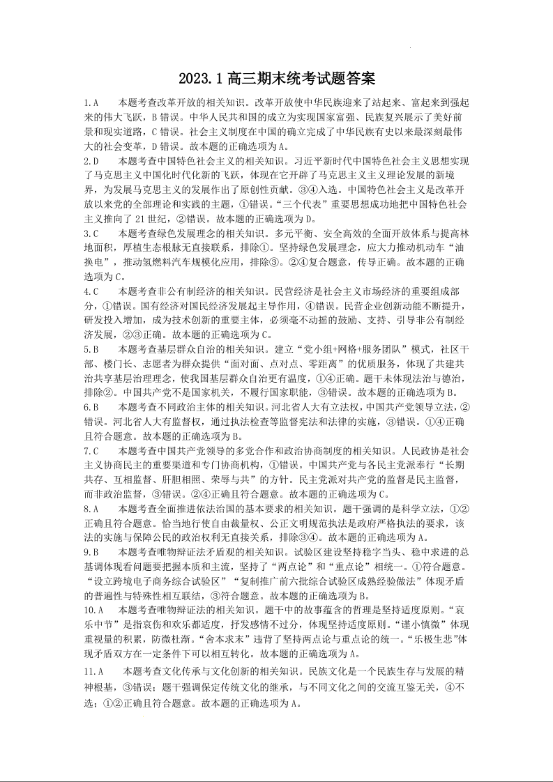 高三政治答案--河北省保定市2023届高三上学期1月期末调研考试