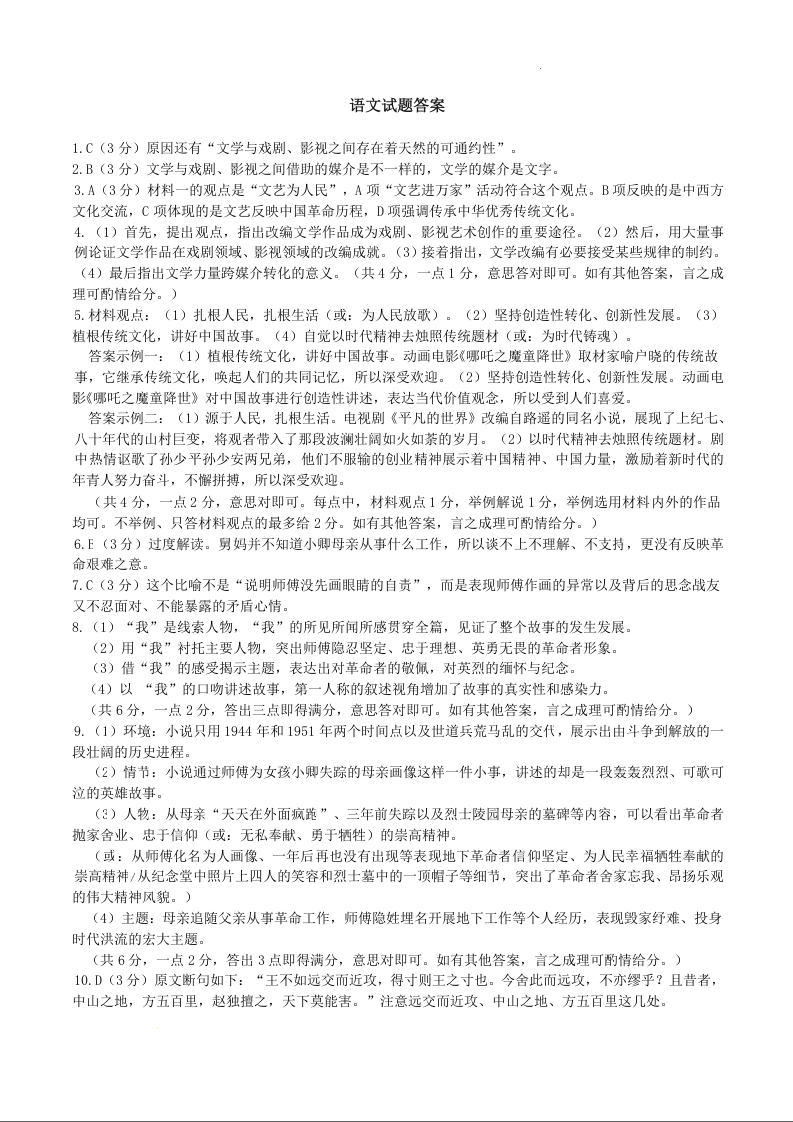 高三语文答案--河北省保定市2023高三上学期1月期末调研考试