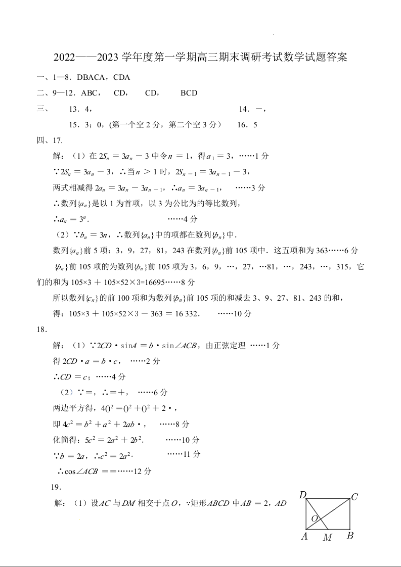高三数学答案--河北省保定市2023高三上学期1月期末调研考试