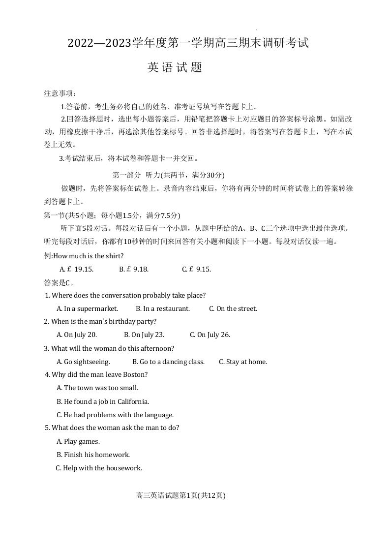 高三英语--河北省保定市2023高三上学期1月期末调研考试
