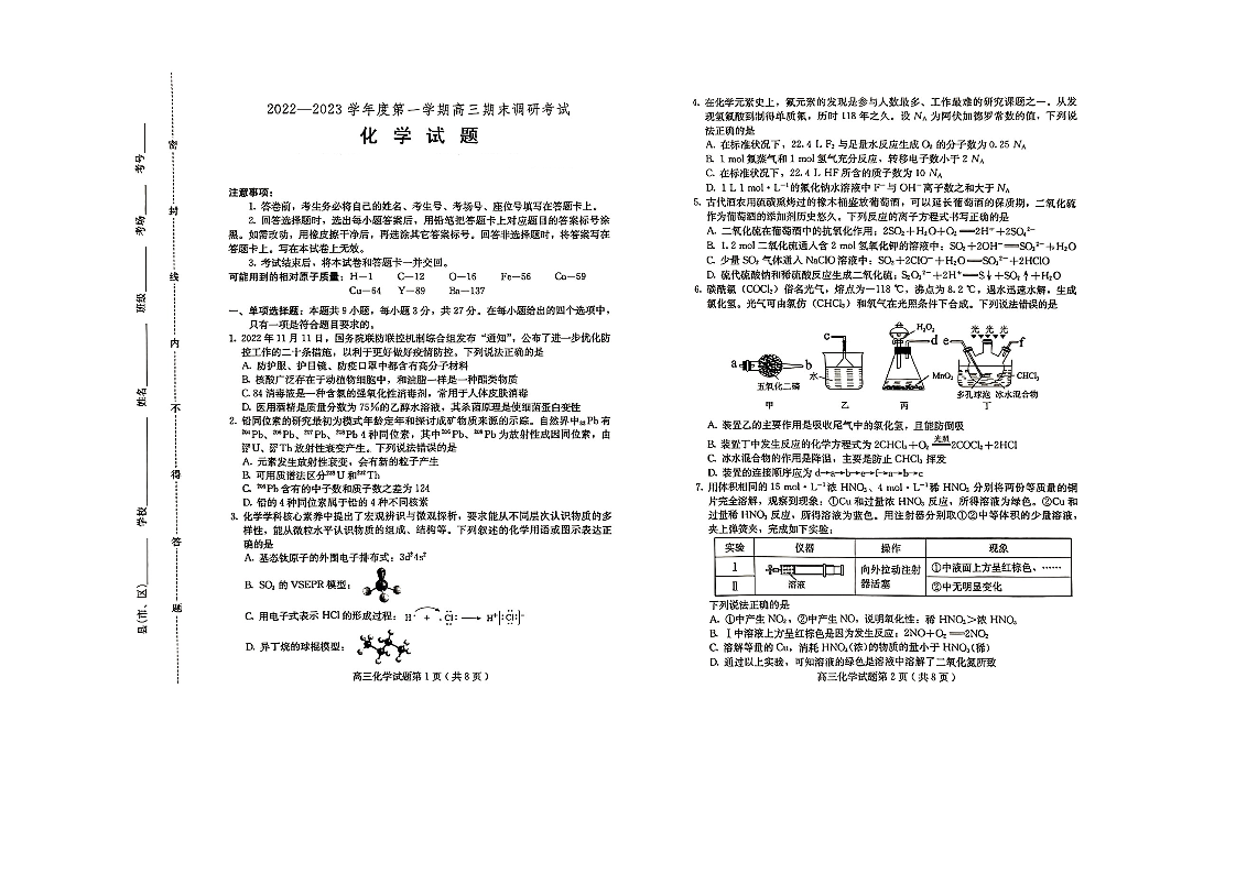 高三化学--河北省保定市2023高三上学期1月期末调研考试