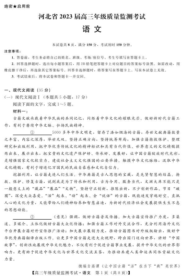 高三语文--河北省2023高三下学期质量监测(开学考)