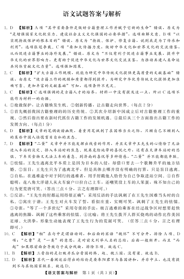 高三语文答案--河北省2023高三下学期质量监测(开学考)