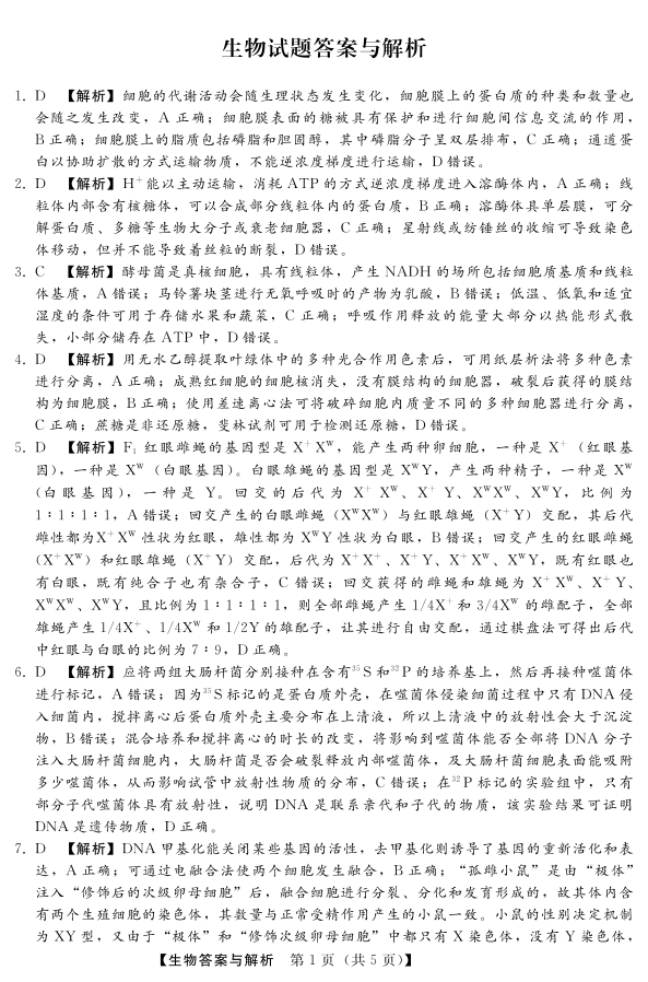 高三生物答案--河北省2023高三下学期质量监测(开学考)