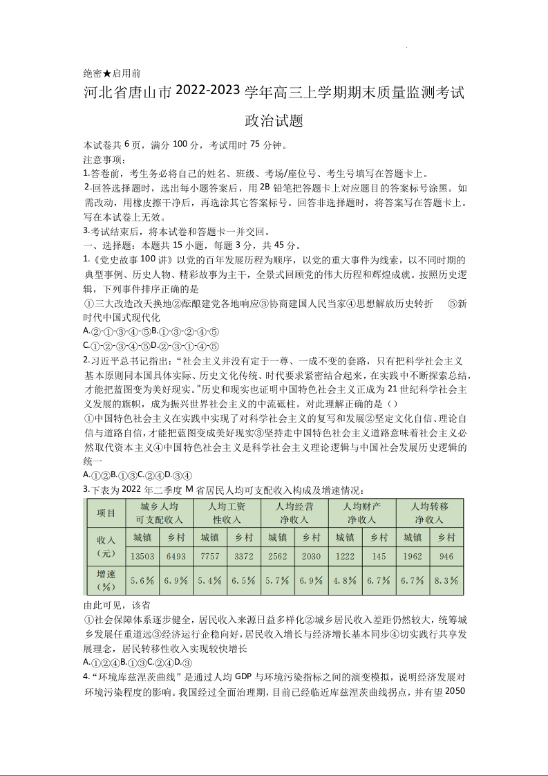 高三政治+答案--河北省2023高三下学期质量监测(开学考)
