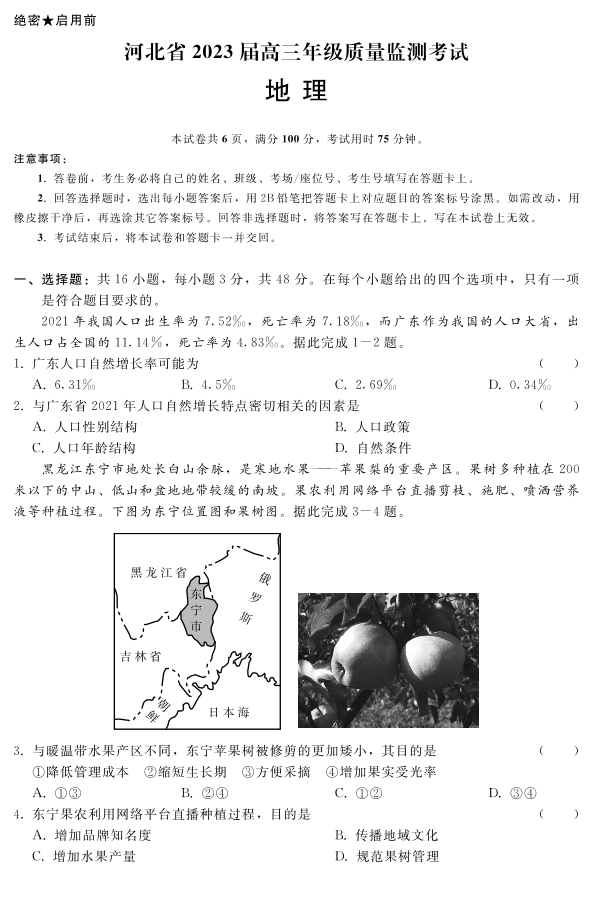 高三地理--河北省2023高三下学期质量监测(开学考)