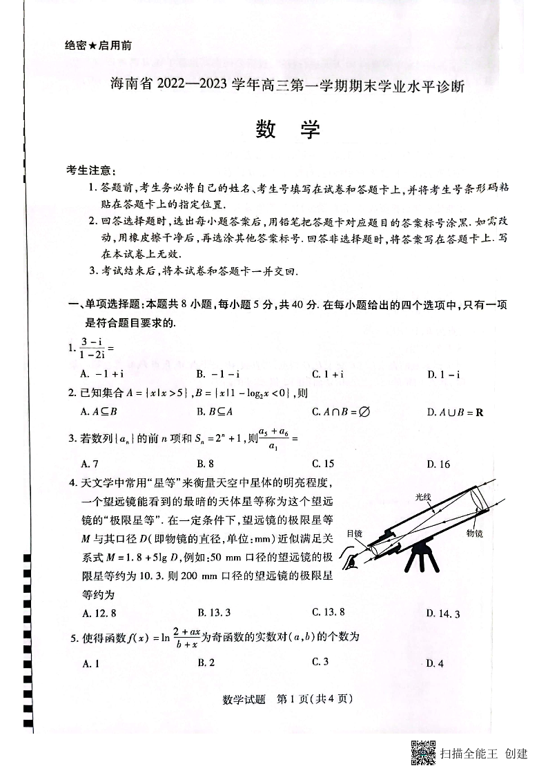 高三数学--海南省2022-2023学年高三上学期期末学业水平诊断