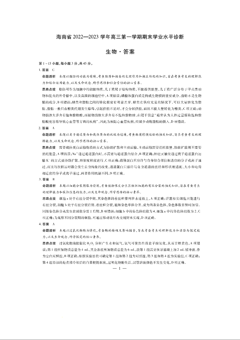 高三生物答案--海南省2022-2023学年高三上学期期末学业水平诊断