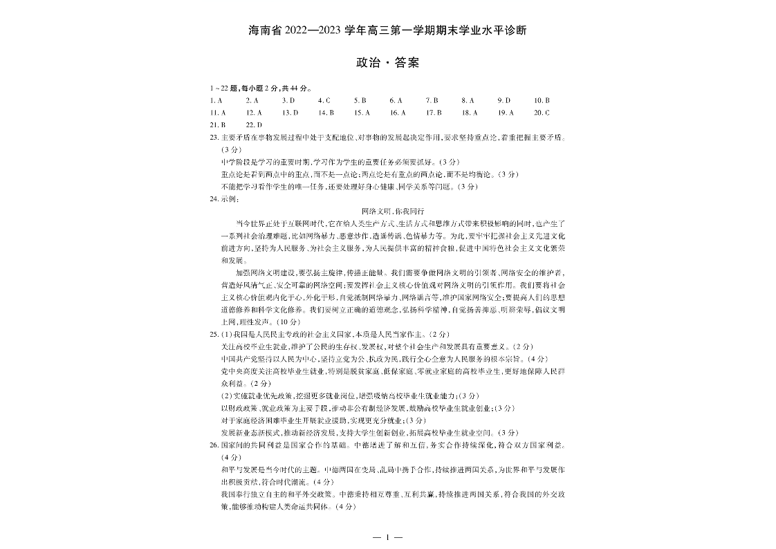 高三政治答案--海南省2022-2023学年高三上学期期末学业水平诊断
