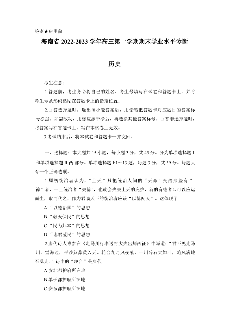 高三历史--海南省2022-2023学年高三上学期期末学业水平诊断