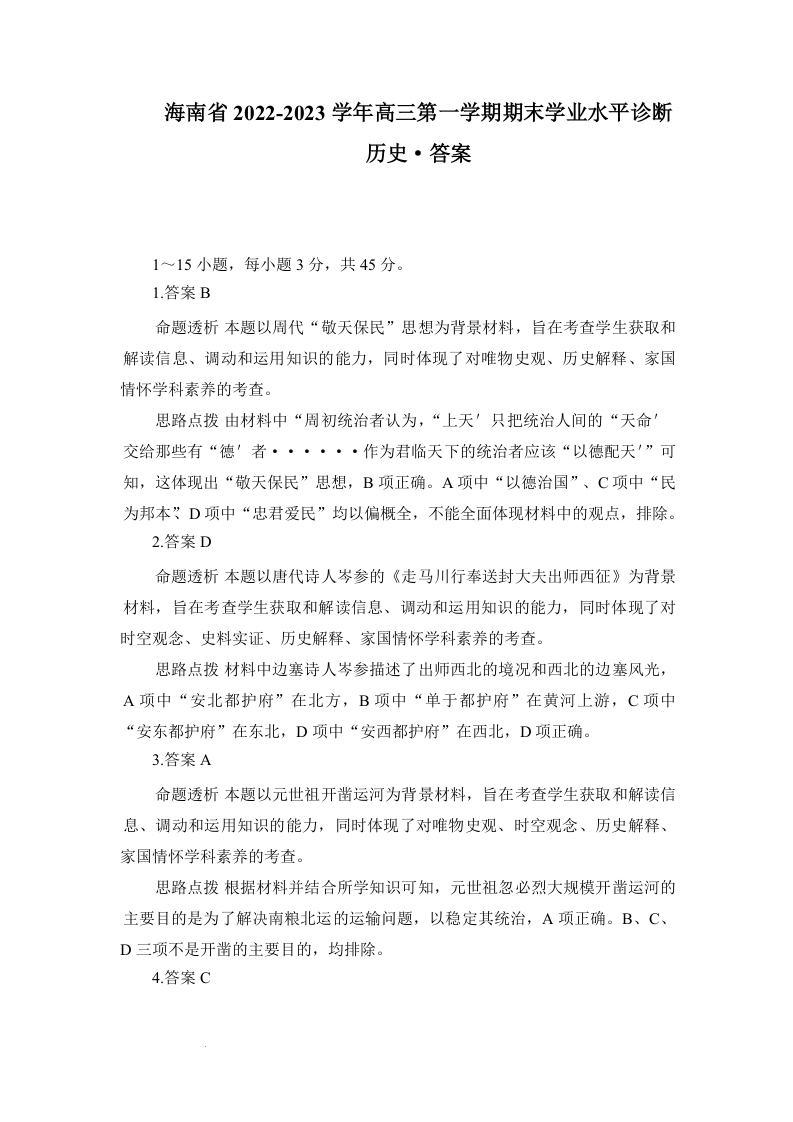高三历史答案--海南省2022-2023学年高三上学期期末学业水平诊断