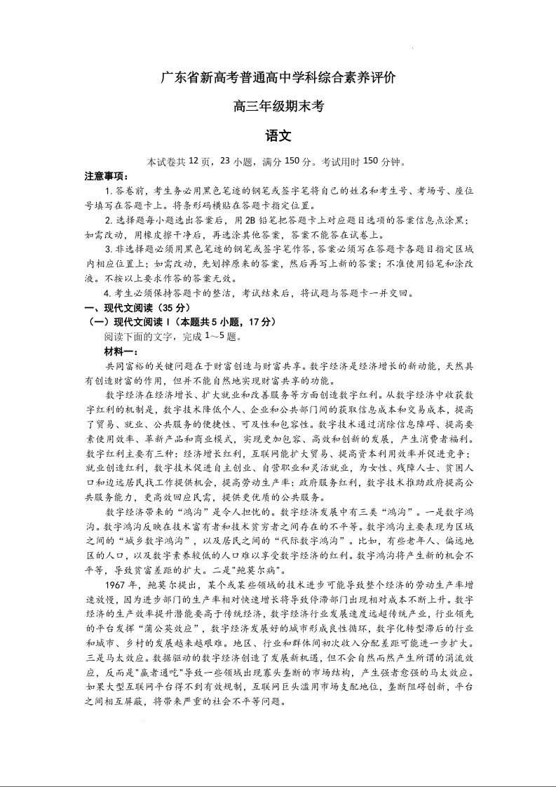 高三语文+答案--广东省新高考2023普通高中学科综合素养评价