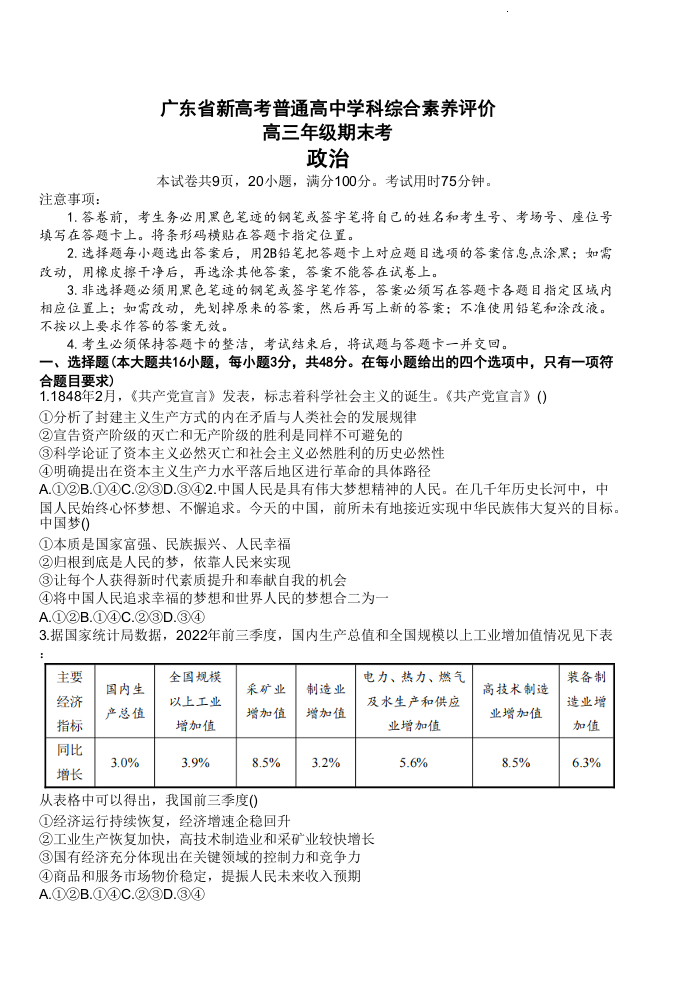 高三政治+答案--广东省新高考2023普通高中学科综合素养评价