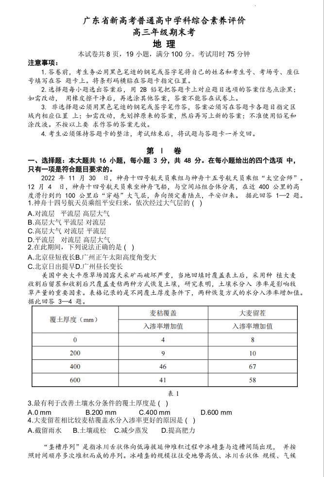 高三地理+答案--广东省新高考2023普通高中学科综合素养评价