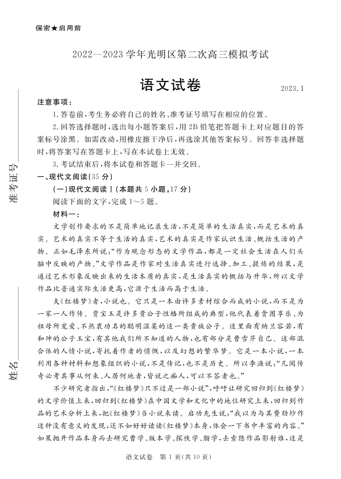 高三语文--广东省深圳市光明区2023高三上学期1月第二次模拟考试