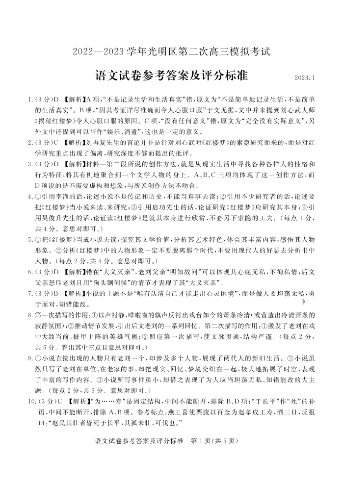 高三语文答案--广东省深圳市光明区2023高三上学期1月第二次模拟考试