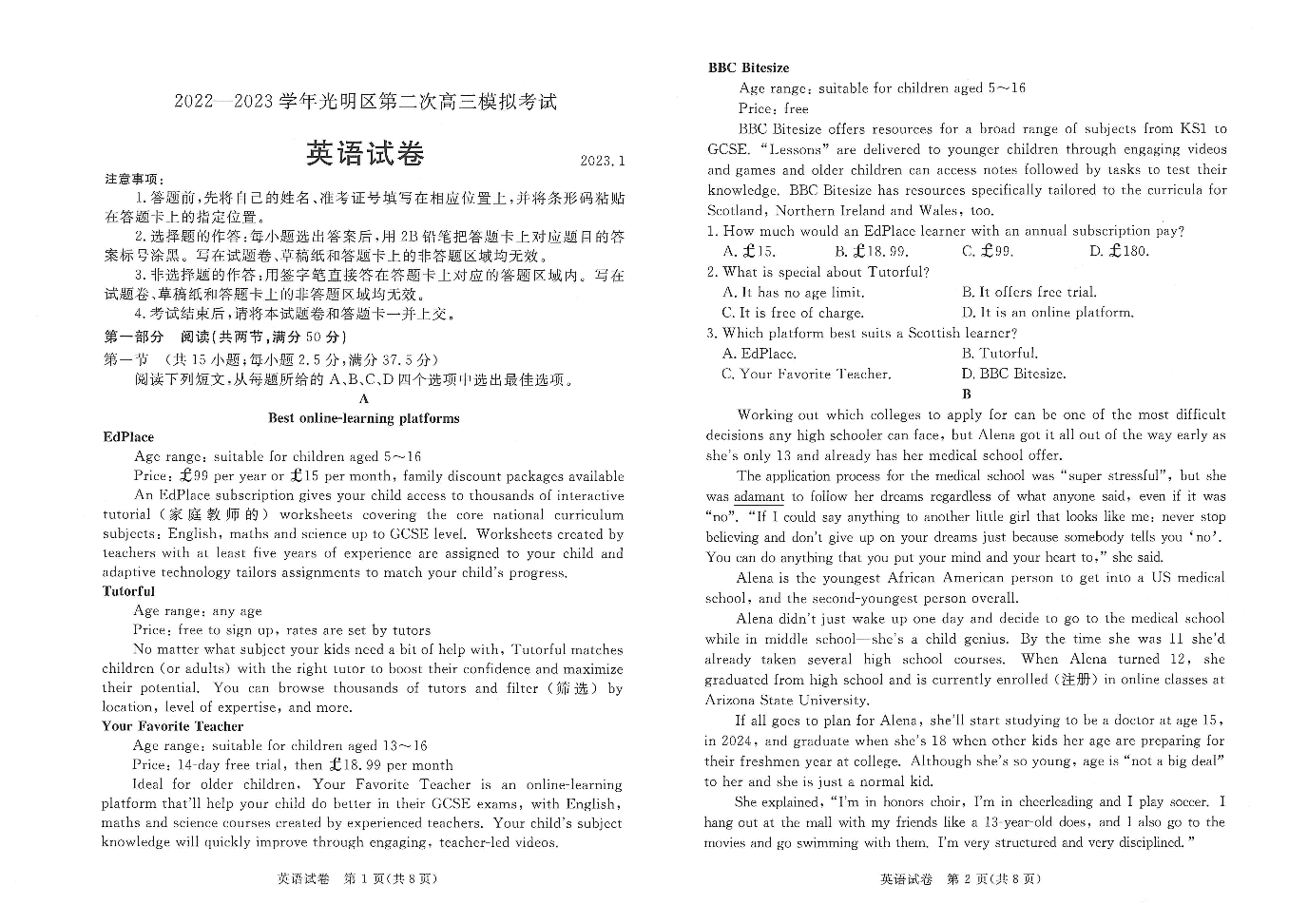 高三英语--广东省深圳市光明区2023高三上学期1月第二次模拟考试