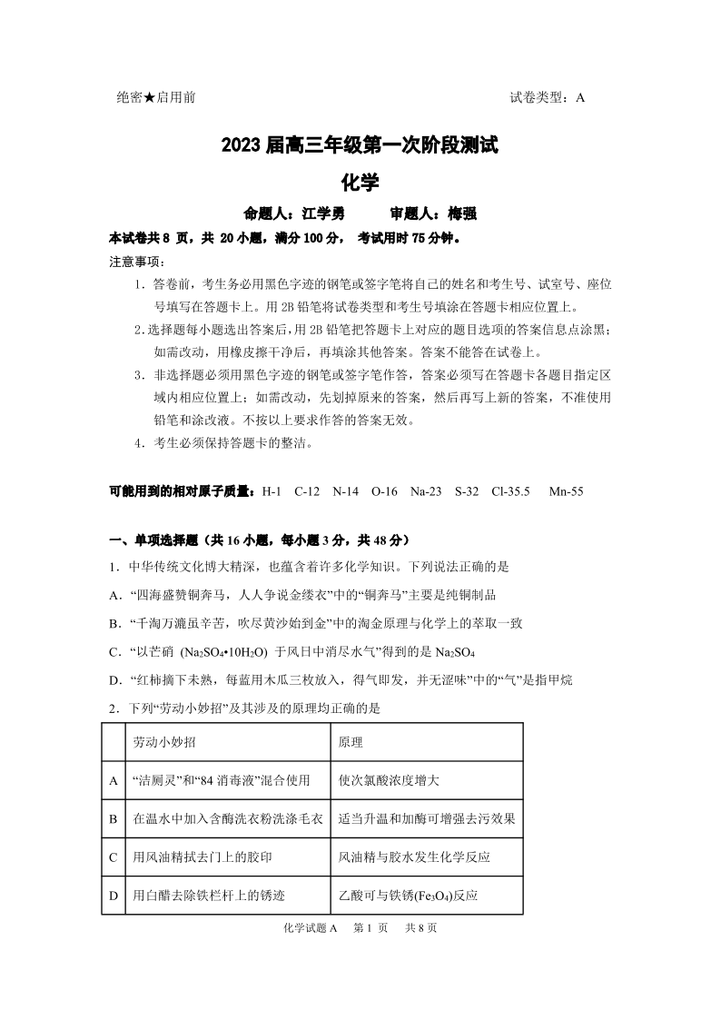 高三化学--广东省深圳中学2023高三上学期第一次阶段测试
