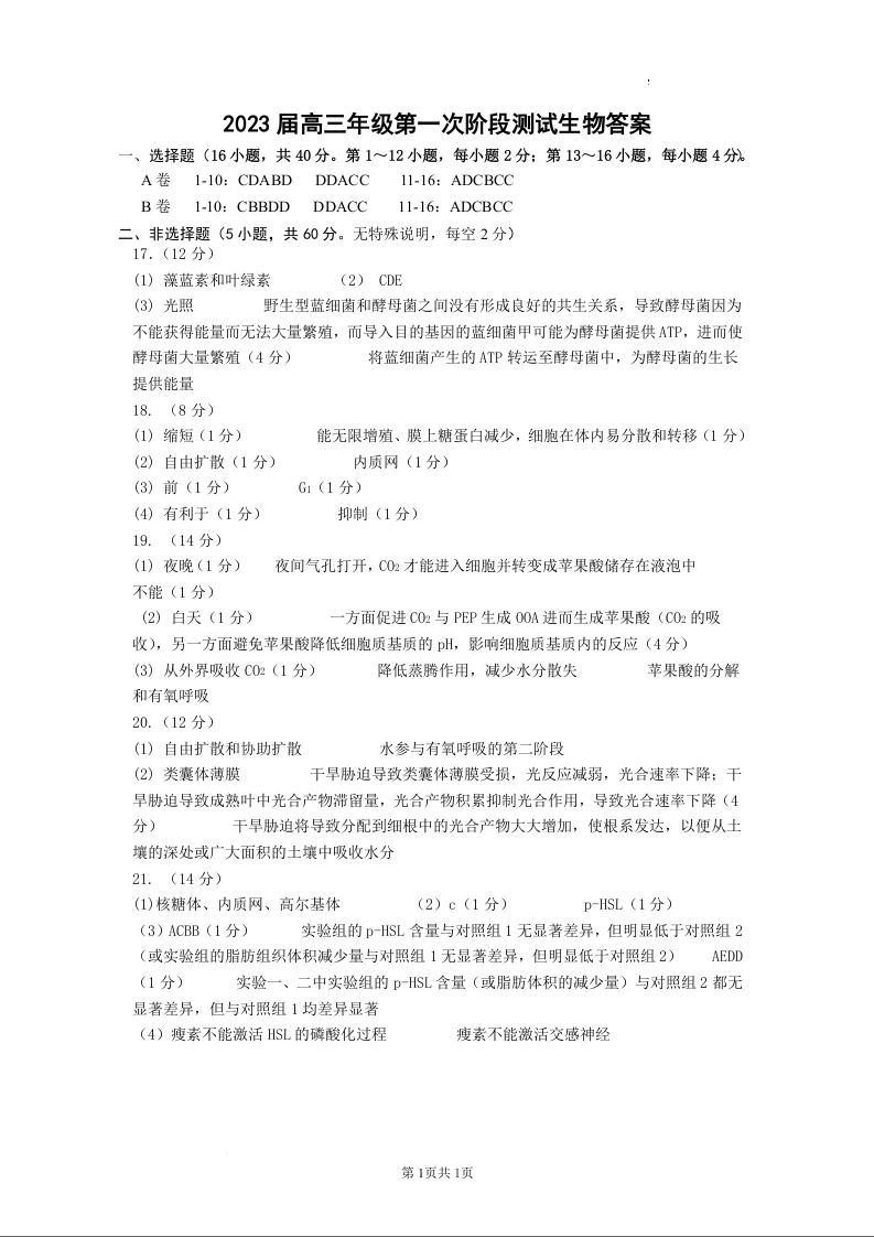 高三生物答案--广东省深圳中学2023高三上学期第一次阶段测试