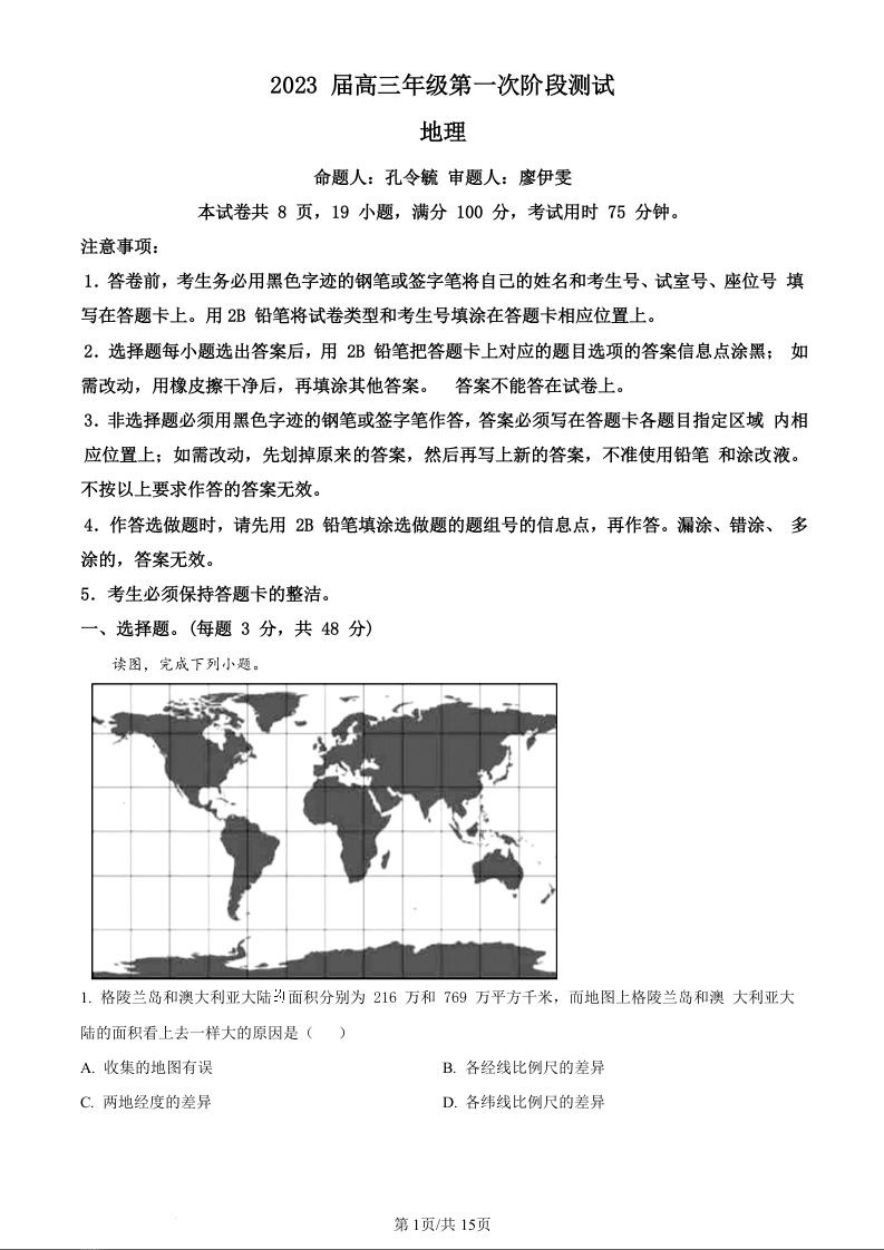 高三地理+答案--广东省深圳中学2023高三上学期第一次阶段测试