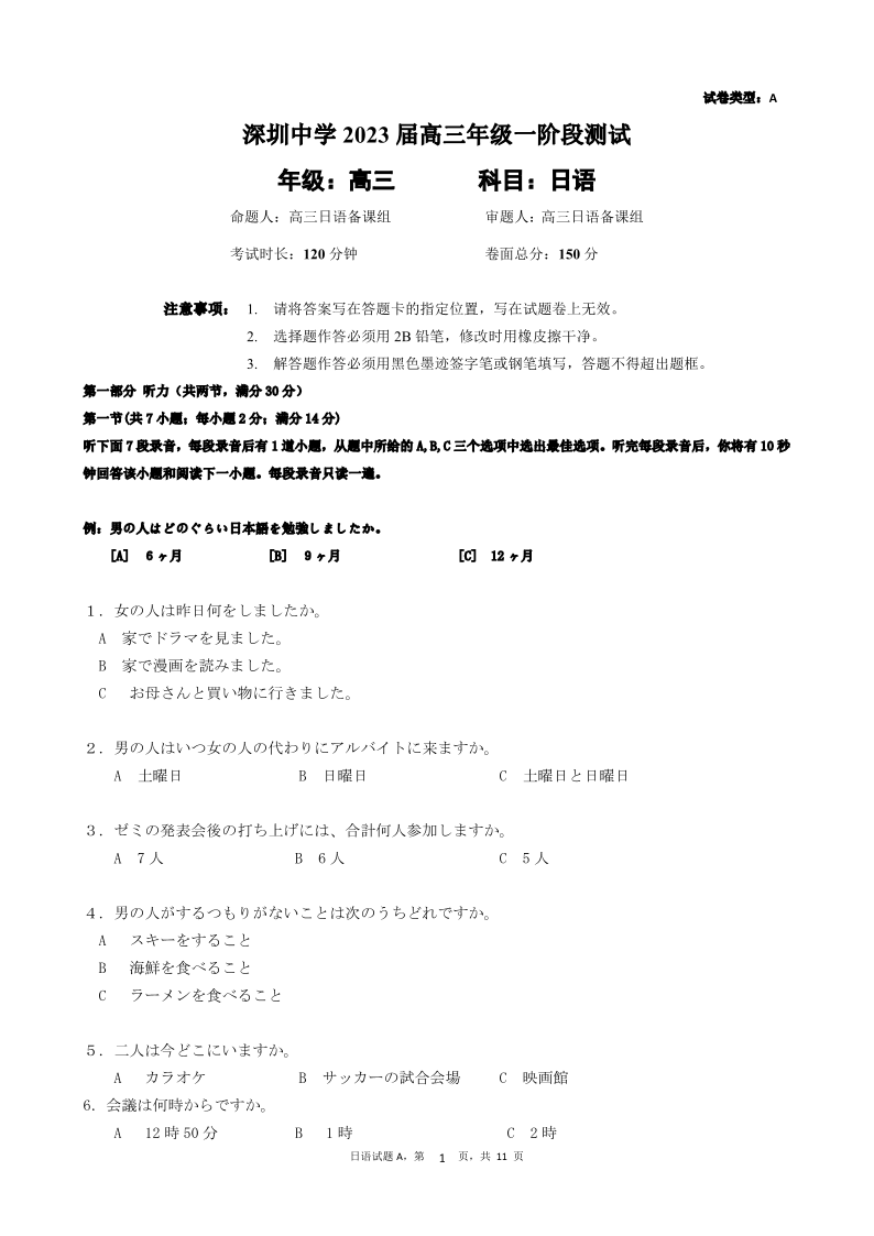 高三日语A--广东省深圳中学2023高三上学期第一次阶段测试