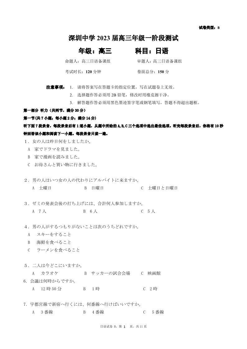 高三日语B--广东省深圳中学2023高三上学期第一次阶段测试