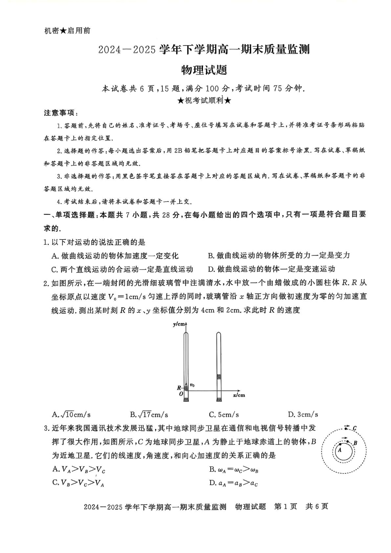 高一物理+答案--河南省信阳市普通高中2024-2025学年高一下学期期末考试