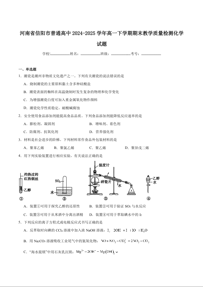 高一化学+答案--河南省信阳市普通高中2024-2025学年高一下学期期末考试
