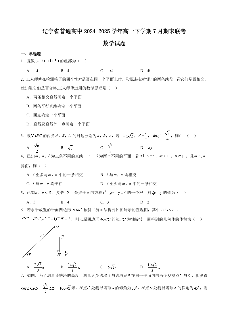 高一数学+答案--辽宁省普通高中2024-2025学年高一下学期7月期末联考试题