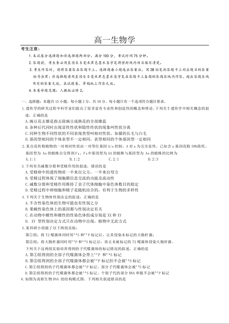 高一生物+答案--辽宁省普通高中2024-2025学年高一下学期7月期末联考试题
