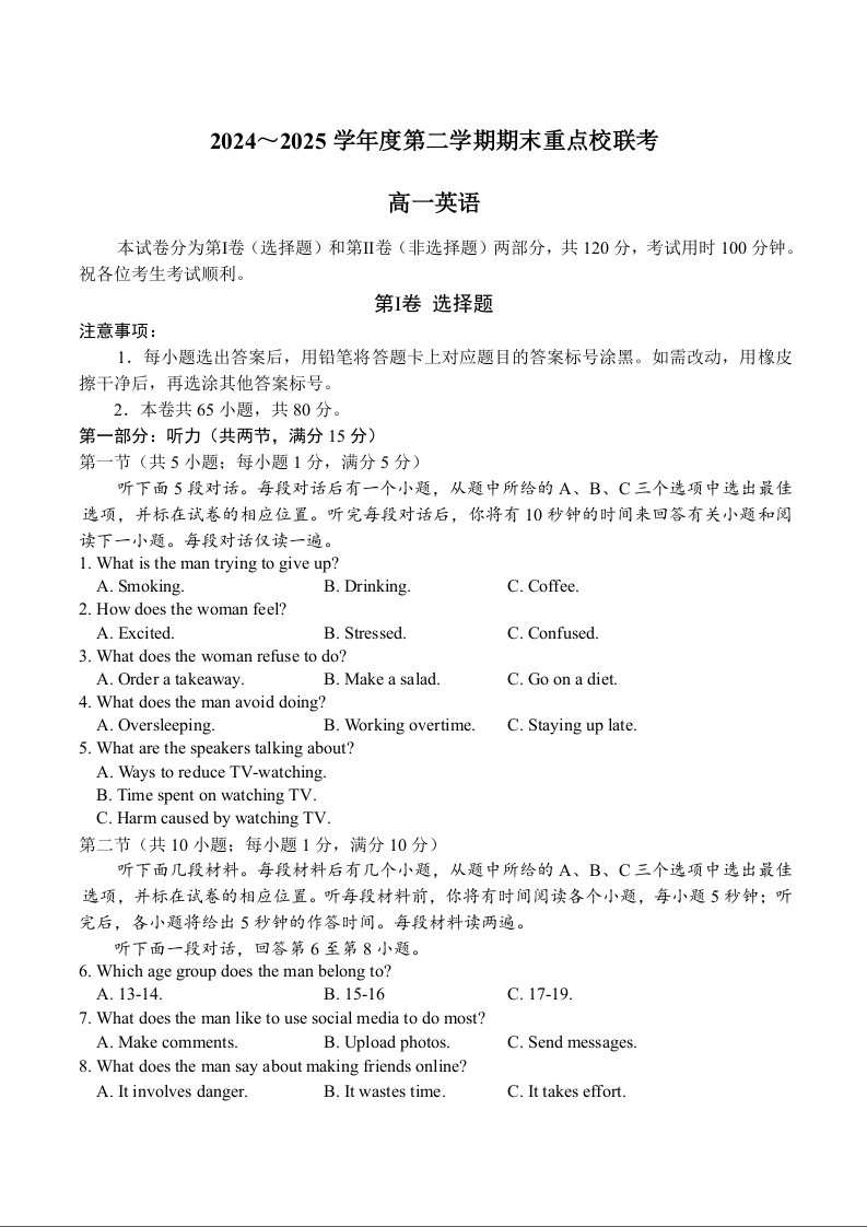 高一英语+答案--天津市五区县重点校2024-2025学年高一下学期7月期末联考试题