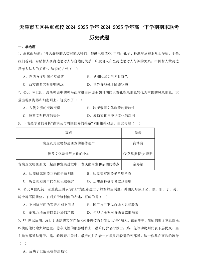 高一历史+答案--天津市五区县重点校2024-2025学年高一下学期7月期末联考试题