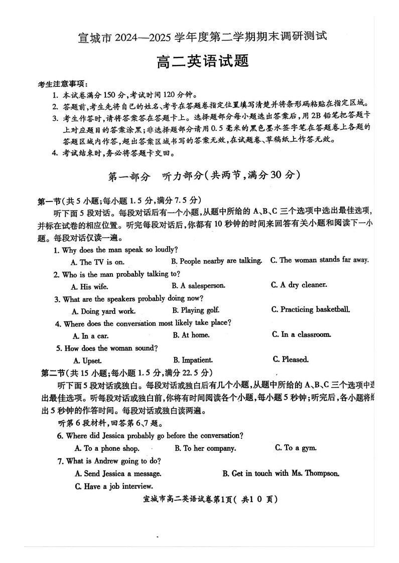 高二英语+答案--安徽省宣城市2024-2025学年高二下学期期末考试