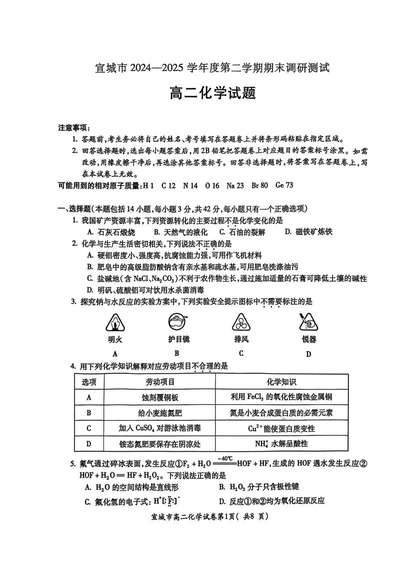 高二化学+答案--安徽省宣城市2024-2025学年高二下学期期末考试