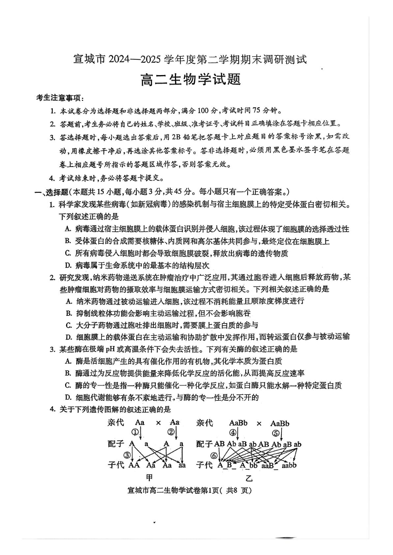 高二生物+答案--安徽省宣城市2024-2025学年高二下学期期末考试