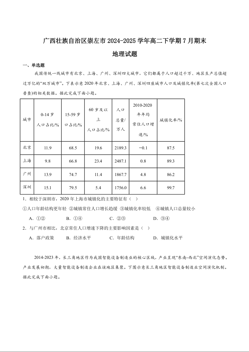 高二地理+答案--广西壮族自治区崇左、贺州、贵港市2024-2025学年高二下学期期末考试