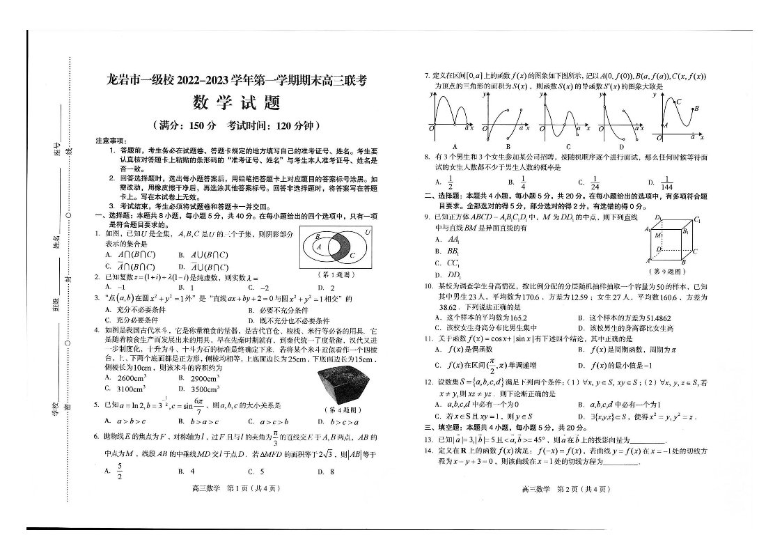 高三数学+答案--福建省龙岩市一级校2022-2023学年高三上学期1月期末联考