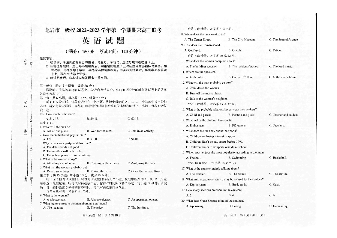 高三英语+答案--福建省龙岩市一级校2022-2023学年高三上学期1月期末联考