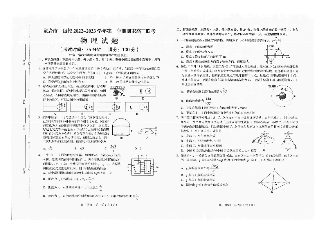 高三物理+答案--福建省龙岩市一级校2022-2023学年高三上学期1月期末联考