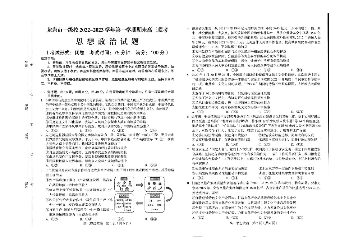 高三政治+答案--福建省龙岩市一级校2022-2023学年高三上学期1月期末联考