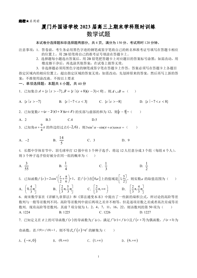高三数学--福建省厦门外国语学校2023届高三上学期期末检测