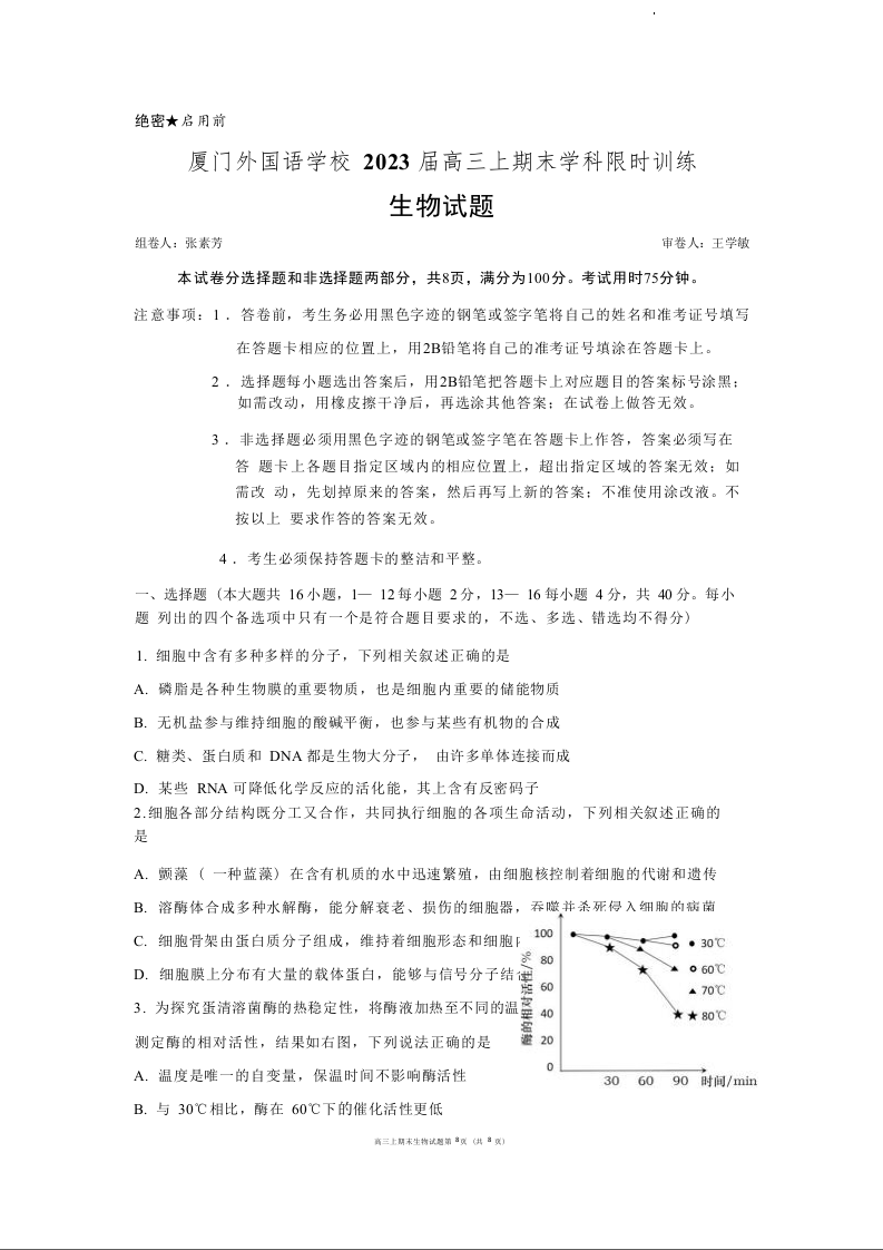 高三生物--福建省厦门外国语学校2023届高三上学期期末检测