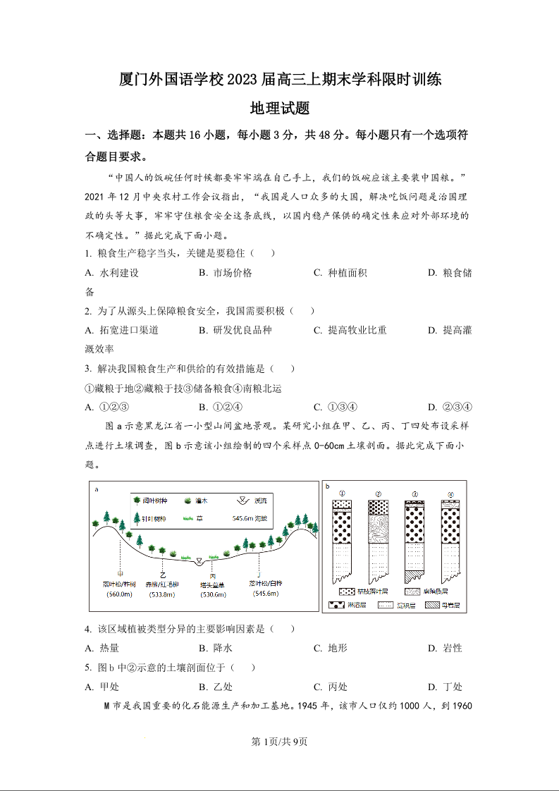 高三地理+答案--福建省厦门外国语学校2023届高三上学期期末检测