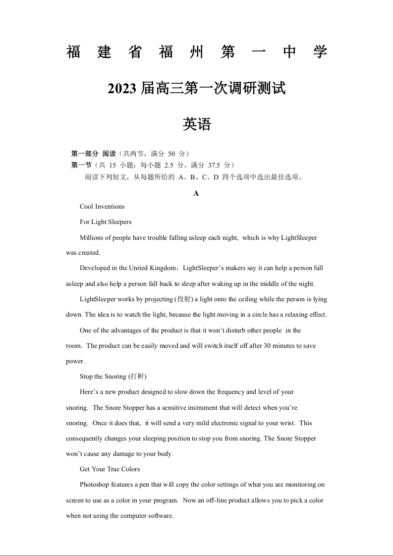 高三英语+答案--福建省福州第一中学2023高三上学期第一次调研测试