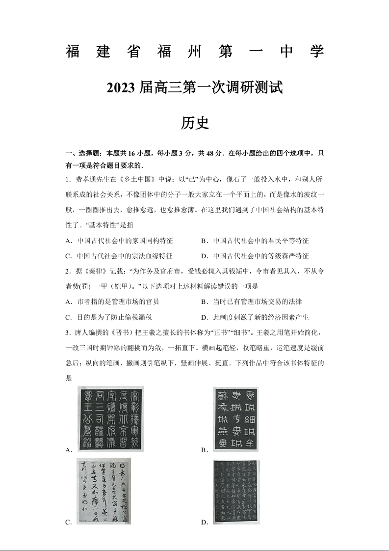 高三历史+答案--福建省福州第一中学2023高三上学期第一次调研测试