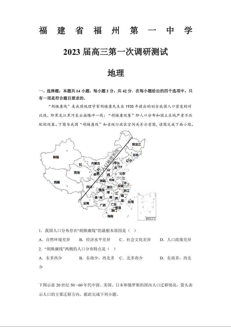 高三地理+答案--福建省福州第一中学2023高三上学期第一次调研测试