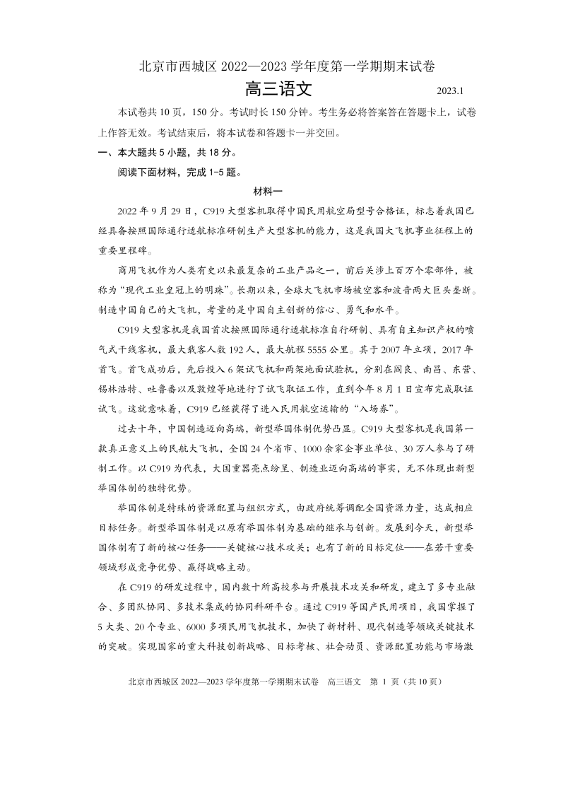 高三语文--北京市西城区2022-2023学年高三上学期期末