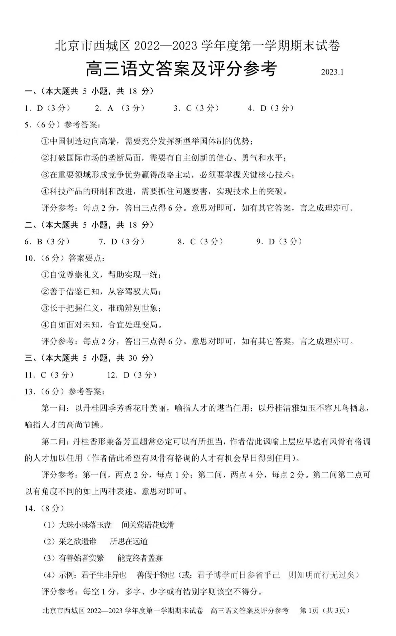 高三语文答案--北京市西城区2022-2023学年高三上学期期末