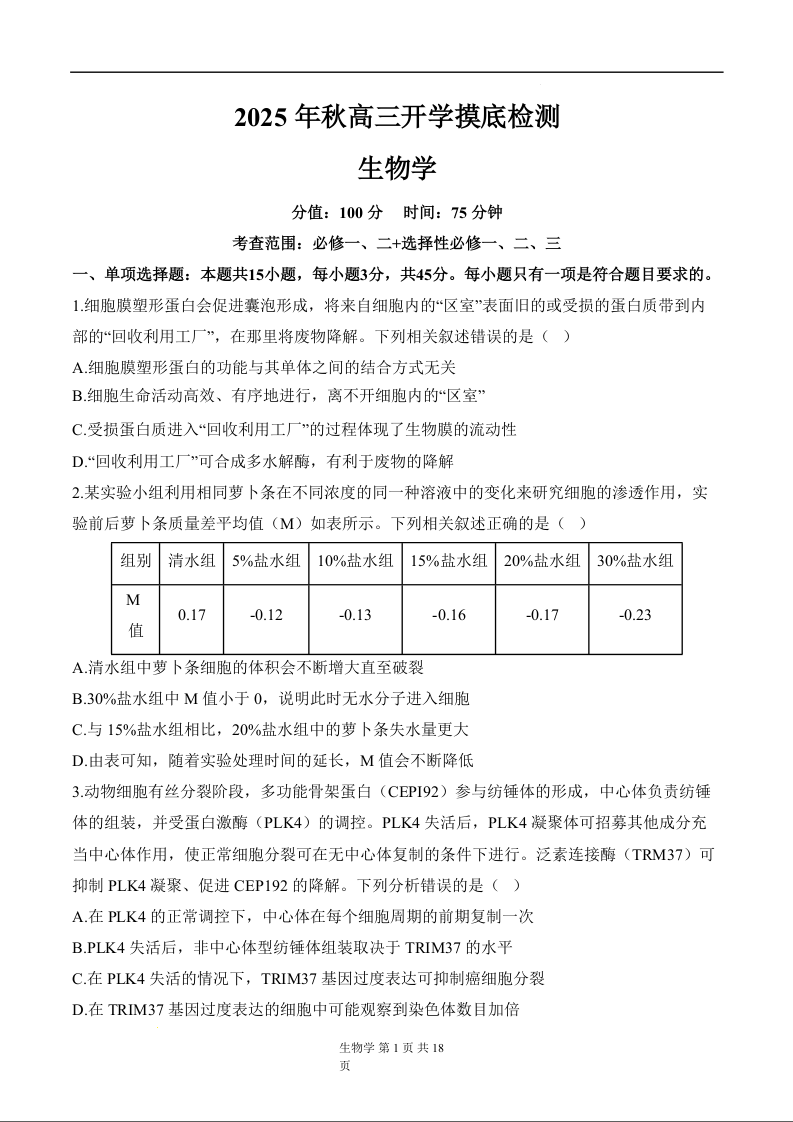 高三生物+答案--安徽省阜阳市临泉第二中学2026届高三上学期8月开学考试
