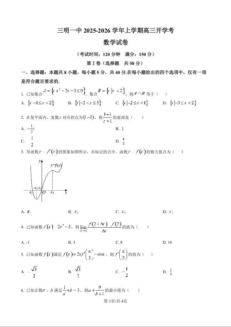 高三数学(原卷版)--福建省三明第一中学2026届高三上学期8月开学考试
